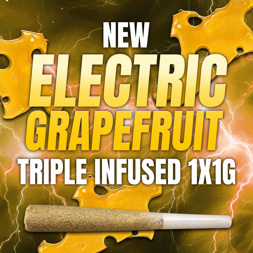 Welcome our newest member of the Shatterizer family with our addition of Electric Grapefruit Triple Infused Pre-Roll (1 Gram) with Electric Grapefruit Shatter, Diamonds & Kief, coming in at 44% - 50% THC! This is our newest Sativa favourite, a citrusy, sweet & sour strain hailing from real Acapulco Gold and Grapefruit Tangie genetics (with lineage to Cinderella ‘99)